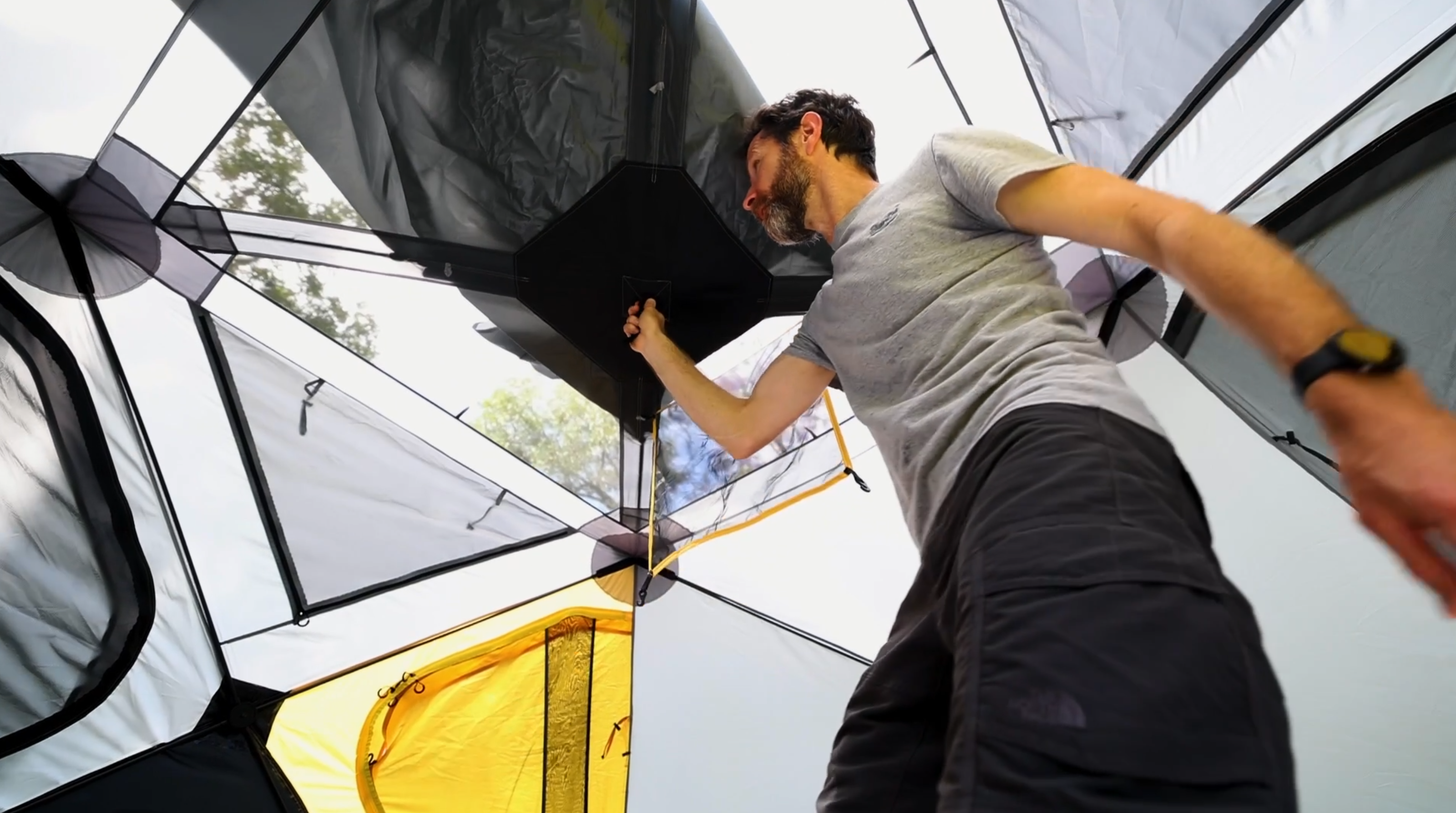 Access and windows: Two triangle doors with insect screens, helpfully outlined in yellow for easy set-up orientation, two large triangle windows with insect screens, two higher triangle windows with insect screens, four ceiling triangle windows with insect screens for ventilation or star-gazing without the fly.