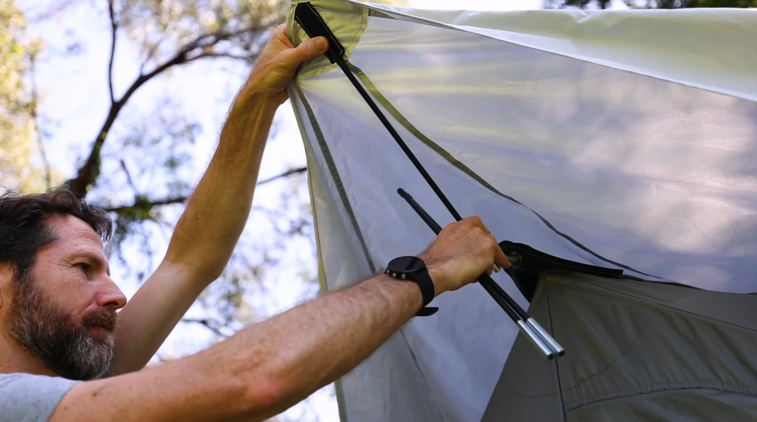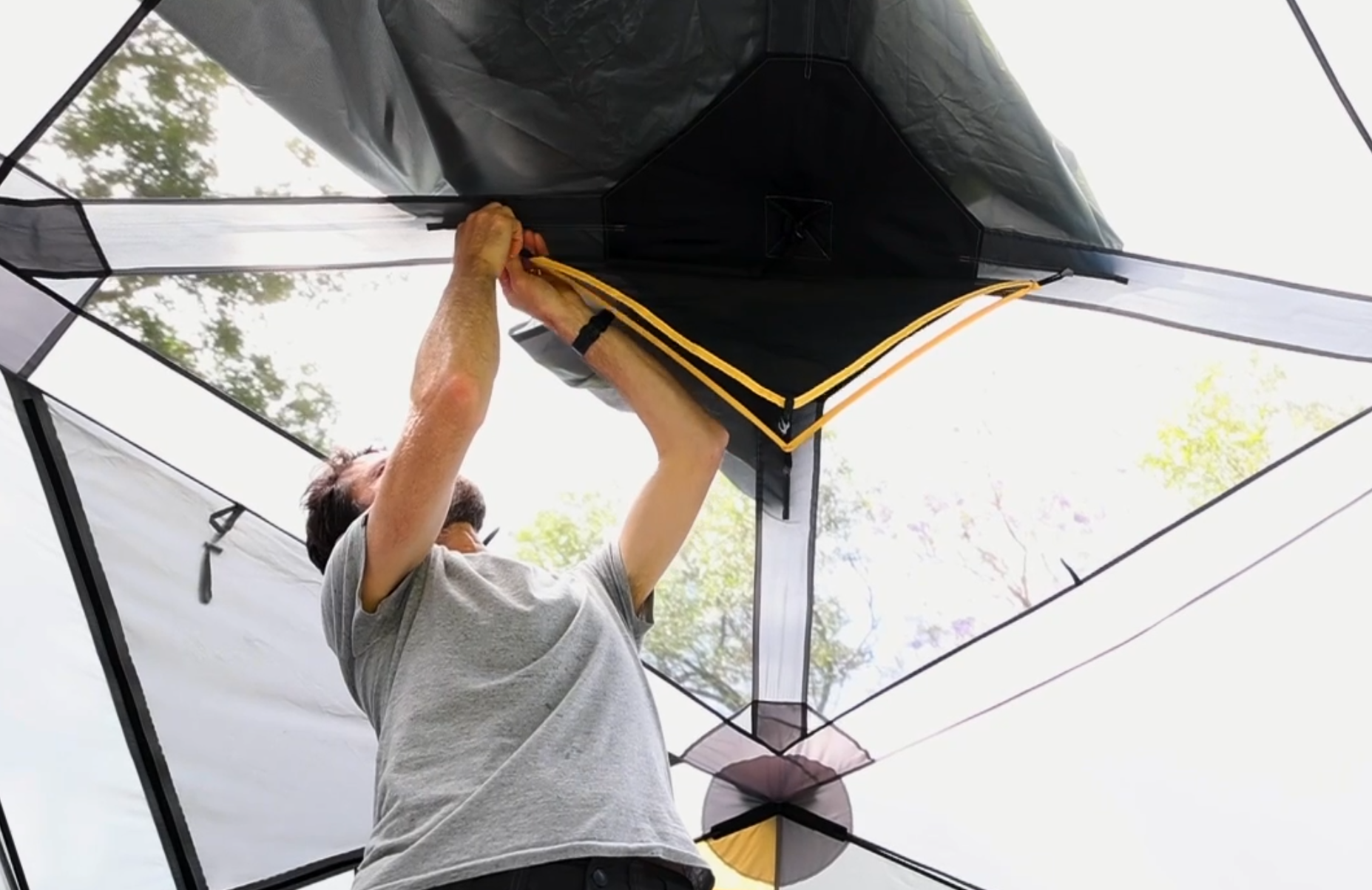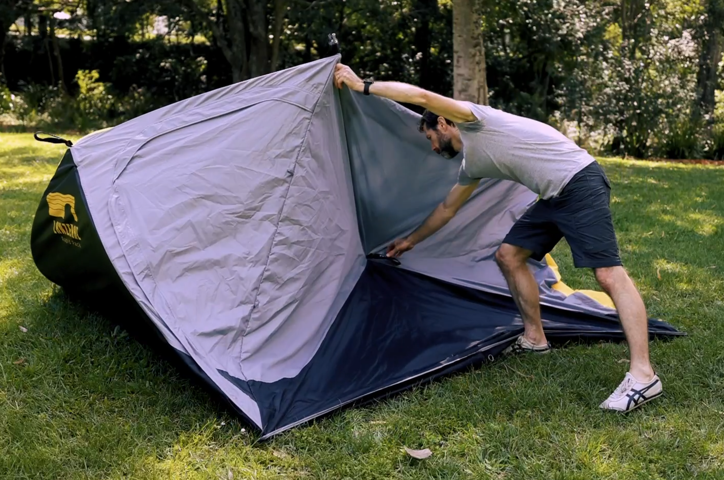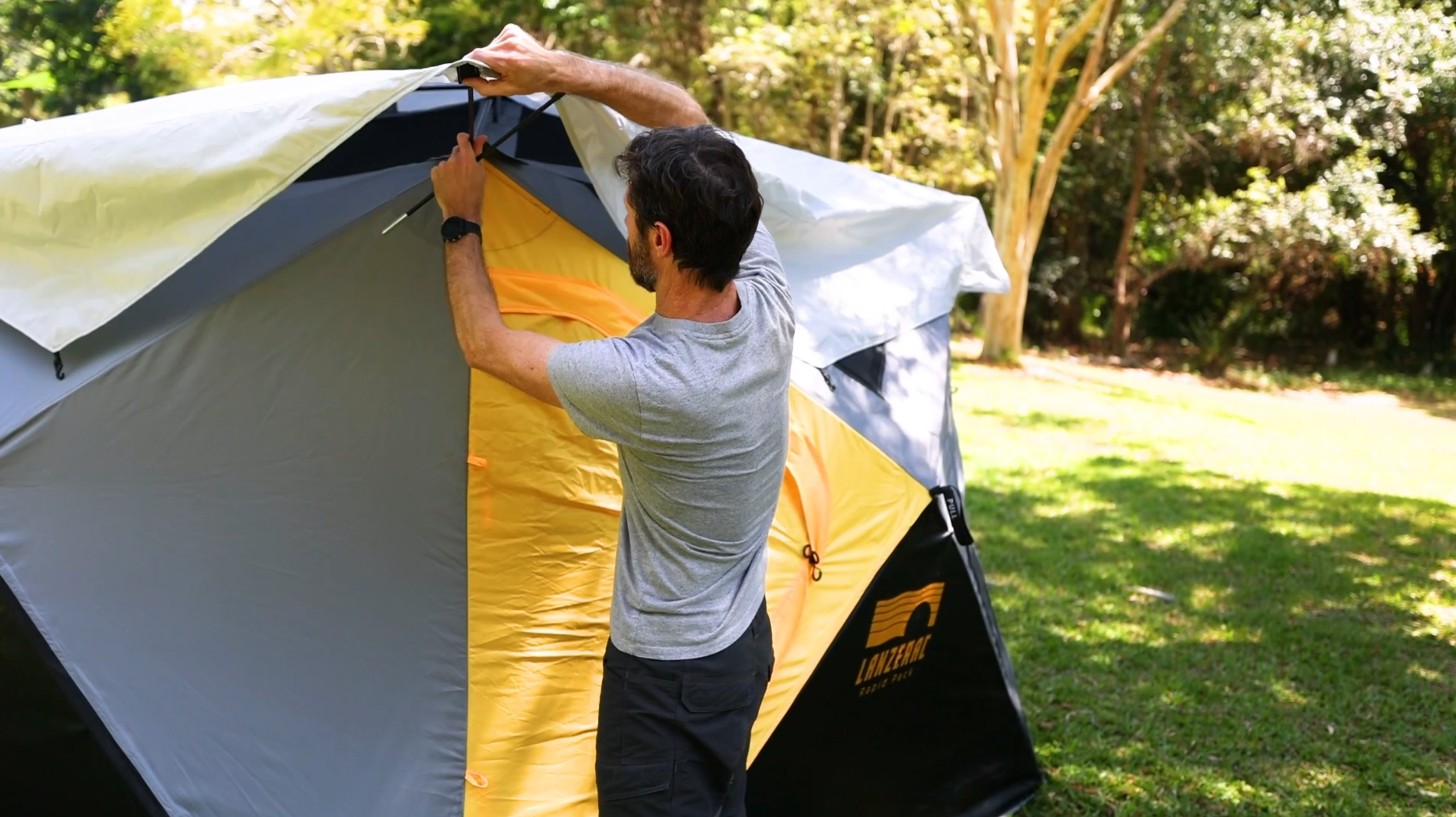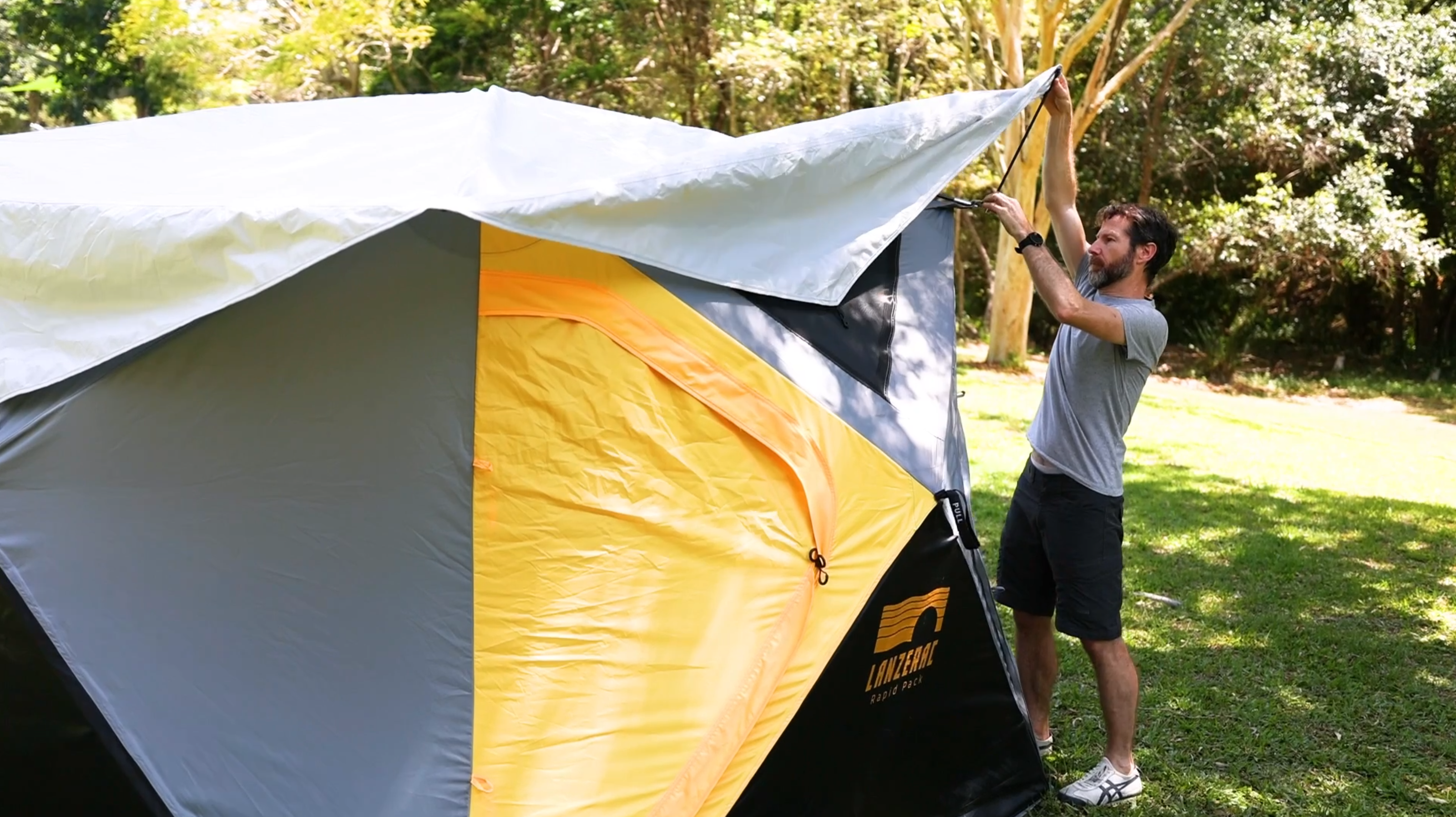 Pop out the four sides in any order, step inside and push the ceiling upward. Fix the corners of the fly, and you're all set.