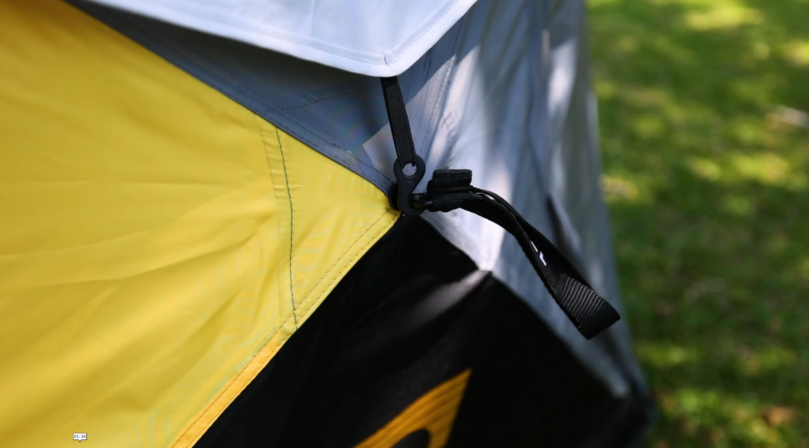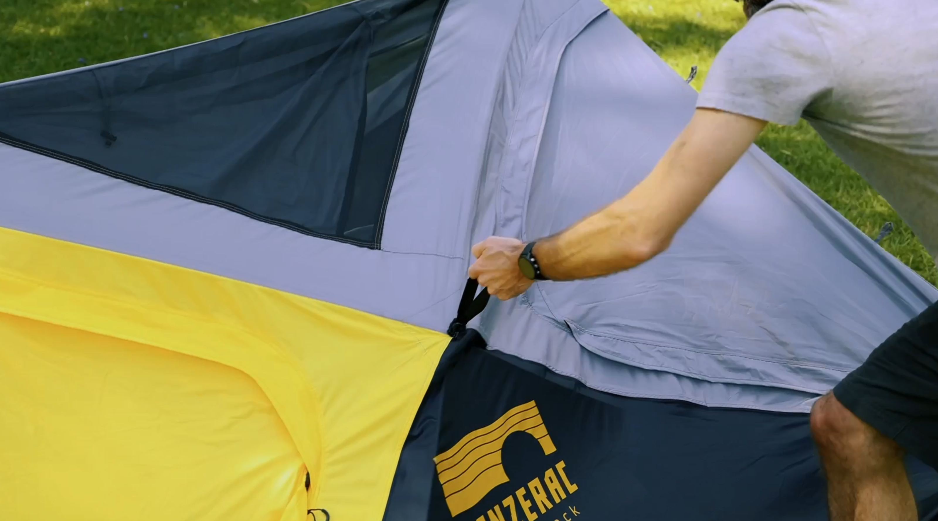 Grab first handle. Don't step on edge of tent.